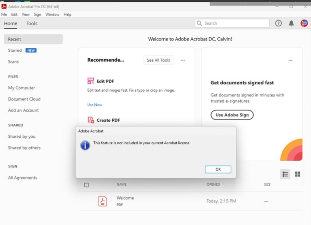 When trying to sign in with correct license the error showed “This feature is not included in your current Acrobat License”
