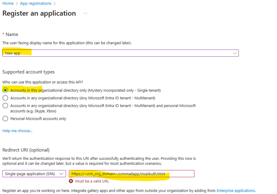 Redirect URL,?Please replace crm_org_domain😕SPA – https://<crm_org_domain>/crmmailapp/msalAuth.html