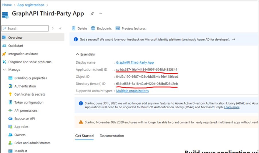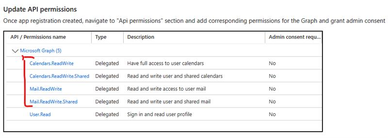Once app registration created, navigate to “Api permissions” section and add corresponding permissions for the Graph and grant admin consent