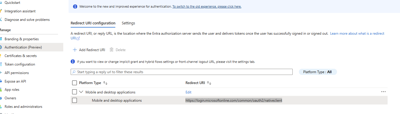 And the following Redirect URI:https://login.microsoftonline.com/common/oauth2/nativeclient