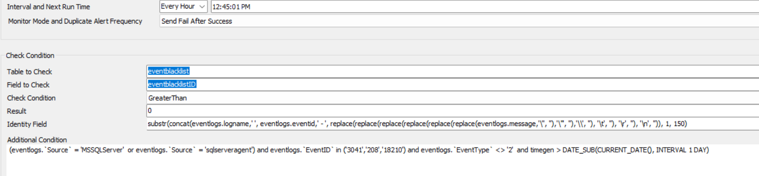 (eventlogs.Source = ‘MSSQLServer’ or eventlogs.Source = ‘sqlserveragent’) and eventlogs.EventID in (‘3041′,’208′,’18210’) and eventlogs.EventType <> ‘2’ and timegen > DATE_SUB(CURRENT_DATE(), INTERVAL 1 DAY)